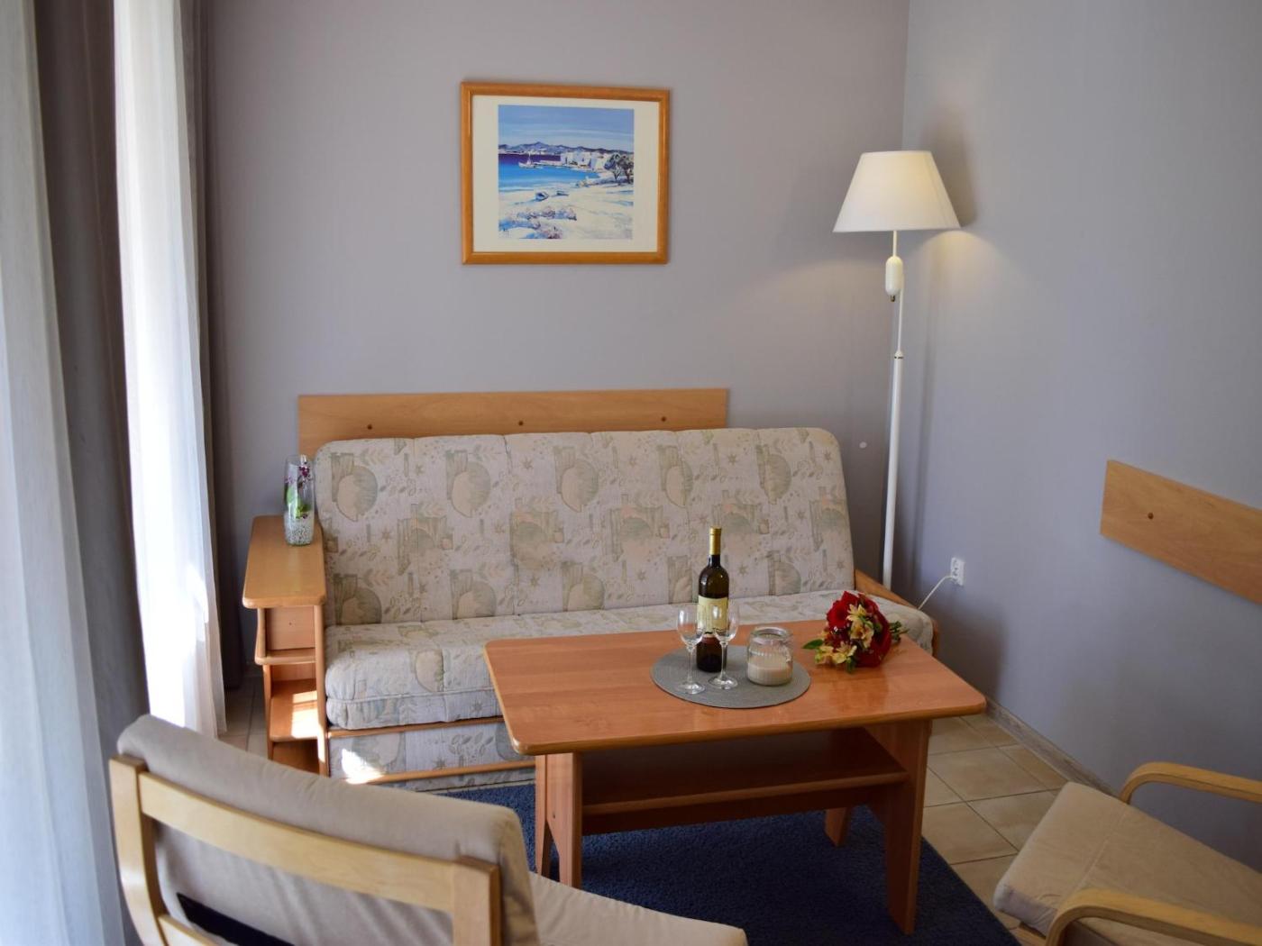 Room #1585878401. This holiday home consists of 1 living room, 2 separate bedrooms and 1 bathroom with a shower. Guests can make meals in the kitchen that is equipped with a refrigerator, a dishwasher, a microwave and an electric kettle. Featuring a terrace with garden views, this holiday home also provides a seating area and a TV with cable channels. The unit offers 5 beds. Dom wakacyjny - 4 osobowy. Powierzchnia pokoju ok.: 58 mkw.